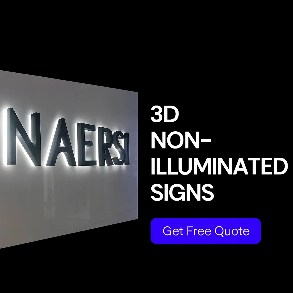 For businesses that want to make a bold statement without lighting, 3D non-illuminated signs provide a professional and elegant appearance. With their dimensional design, durable build, and customizable options, these signs offer a modern look suitable for daytime visibility. Whether it’s a storefront, office, showroom, or corporate building, 3D non-illuminated signs help your business present a polished image that supports customer engagement.