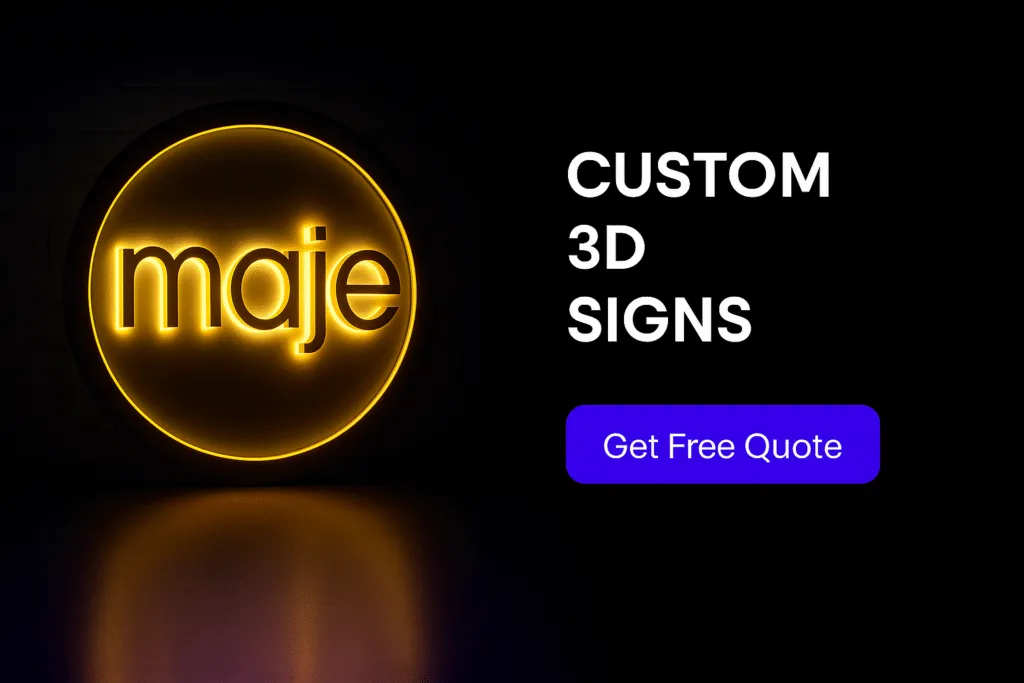 3D signs are a modern style of signage crafted with precision-cut materials and durable backplates. They deliver a bold, dimensional look that enhances visibility and adds sophistication to any space.
