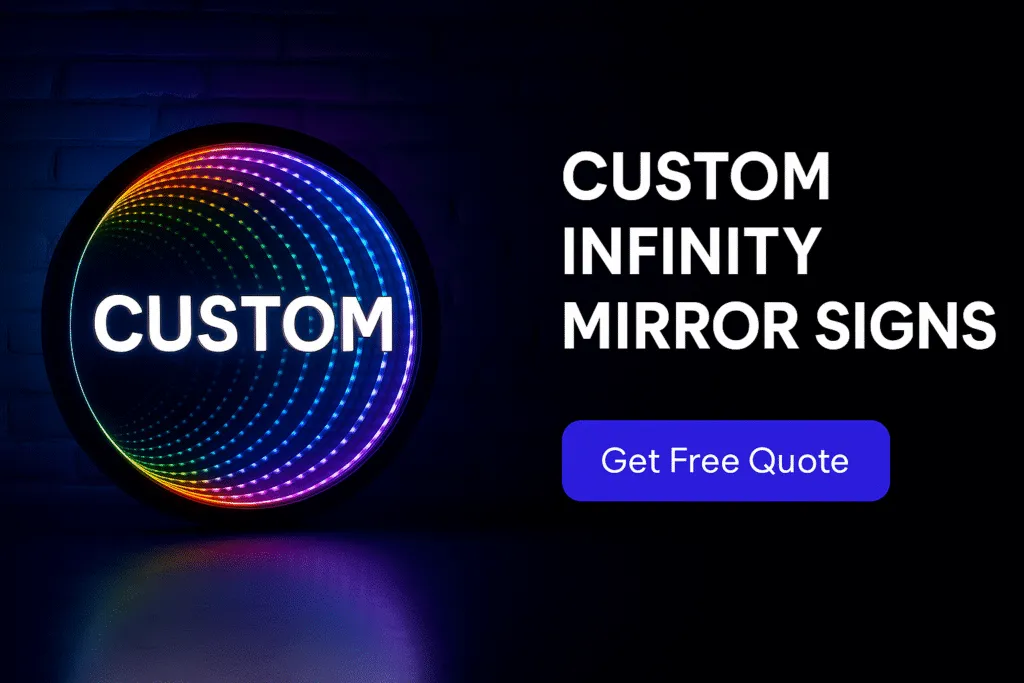Infinity mirror signs are a bold, modern option that blends art with technology to create a unique visual effect. Built with a combination of mirrors, LED lights, and acrylic layers, these signs create the illusion of depth and glowing patterns. They are durable, energy-efficient, and fully customizable—making them suitable for businesses, events, or creative spaces looking for distinctive signage. Whether it’s a small infinity logo for your reception or a large piece for your storefront, these signs are designed to enhance visibility and strengthen your brand presence.